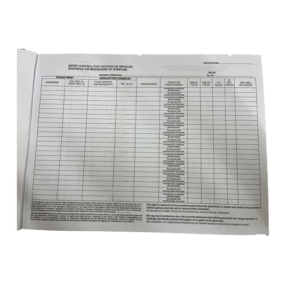 The Entry Control Register – Non Tear Off Slip is a durable logbook used to record and monitor all visitor entries and exits at a secure site. With permanent, bound pages, it captures critical details such as visitor names, time of entry, purpose of visit, and time of exit. This format provides a continuous, tamper-proof record, ensuring robust access control and reliable reference for security audits and investigations.