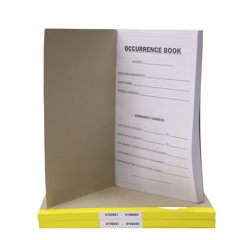 The Occurrence Book is a crucial log for documenting incidents, events, and daily activities within a security operation. Used to record details such as patrols, visitor entries, incidents, and shifts, this book provides an official, time-stamped account, supporting transparency, accountability, and quick reference in investigations or audits.